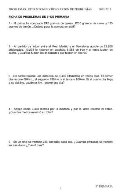- Realiza los siguientes problemas de matemáticas. Sólo tienen que realizar los problemas 1, 2, 4 y las cuentas que aparecen al final del documento. NO hay que realizar las demás cuentas que aparecen al final de la página, sólo las de la hoja de los problemas matemáticos.